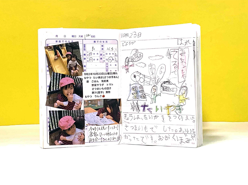 あおぞら保育園では連絡帳にお子様の写真や日記、作品等を貼付しています。何気ない日常の様子や成長を感じていただけます。
